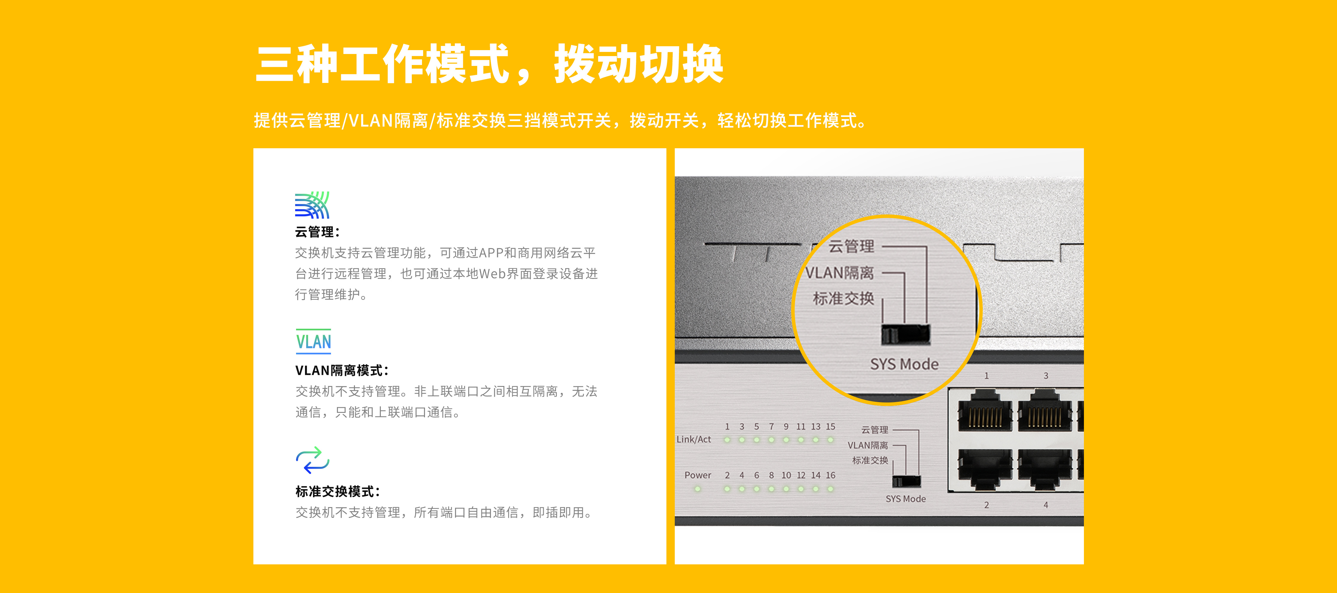 - 支持云管理、VLAN隔离、标准交换三种模式