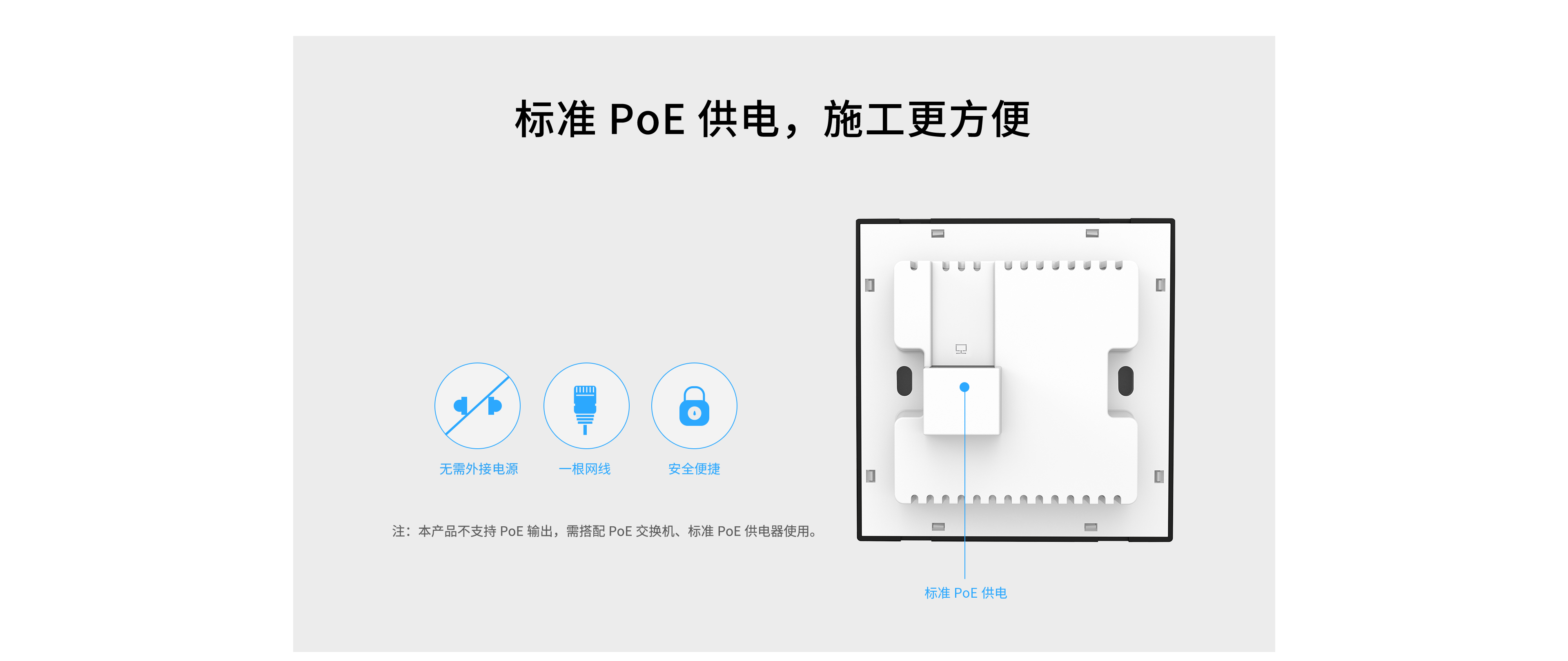 采用标准PoE供电,不用外接电源,每个AP只需一根网线,