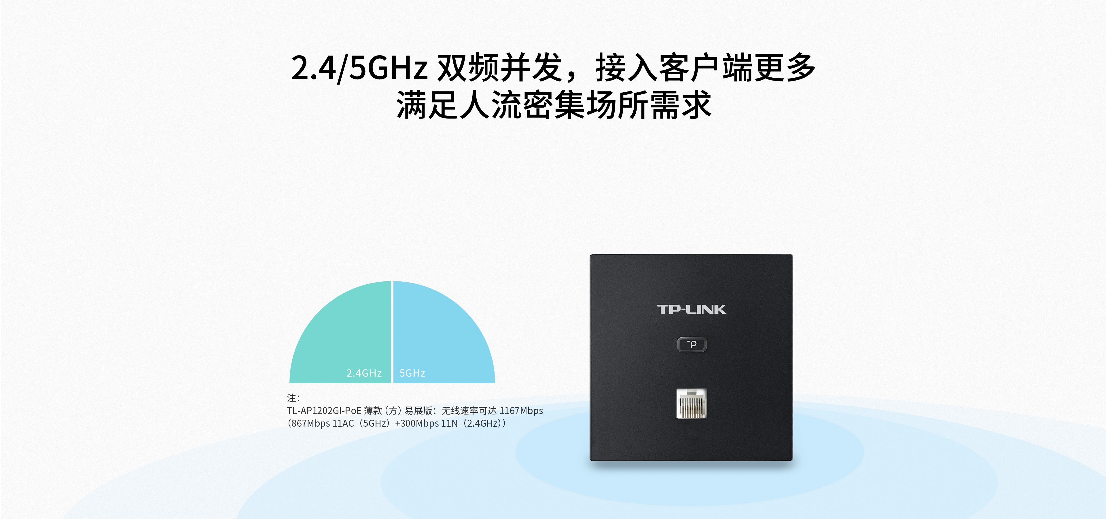 2.4GHz频段兼容性强,传输距离更远。TP-LINK双频无线面板AP,2.4/5GHz双频并发,可接入更多设备,