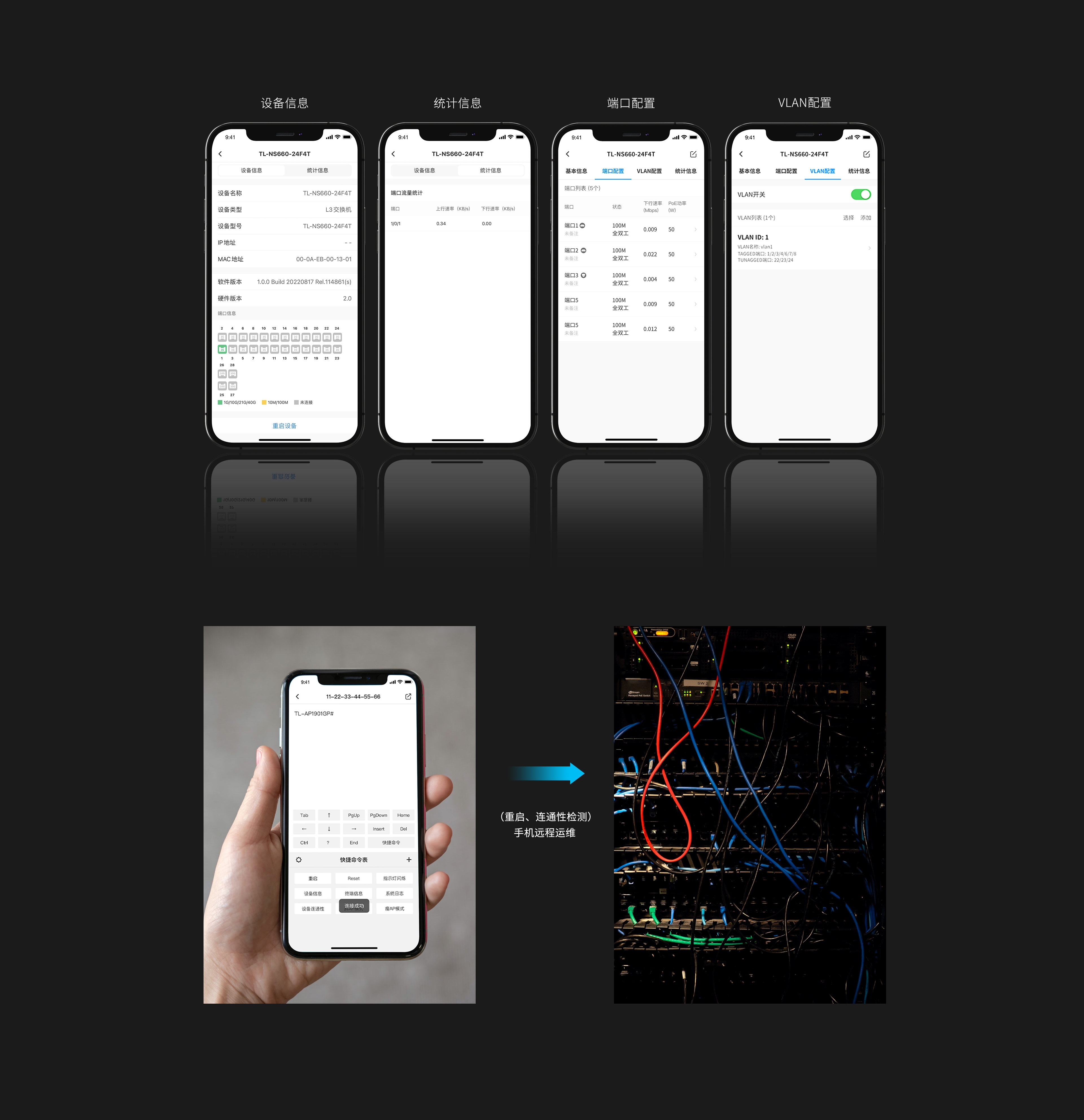统计信息,VLAN配置,端口配置等,调试管理更灵活。