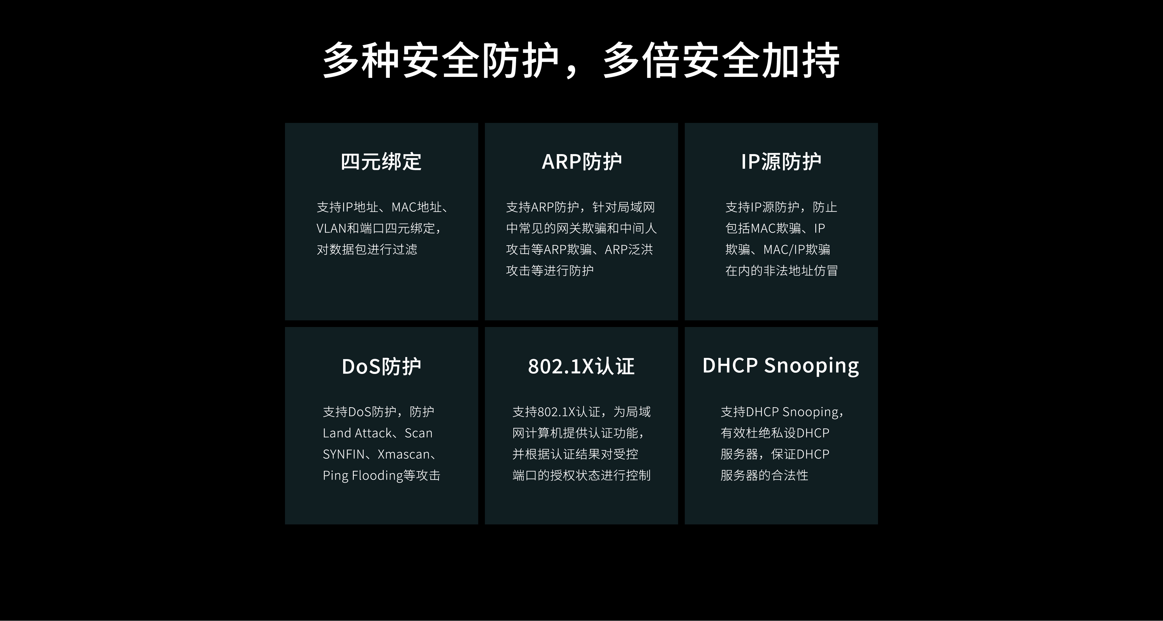 - 支持四元绑定、ARP/IP/DoS防护、802.1X认证