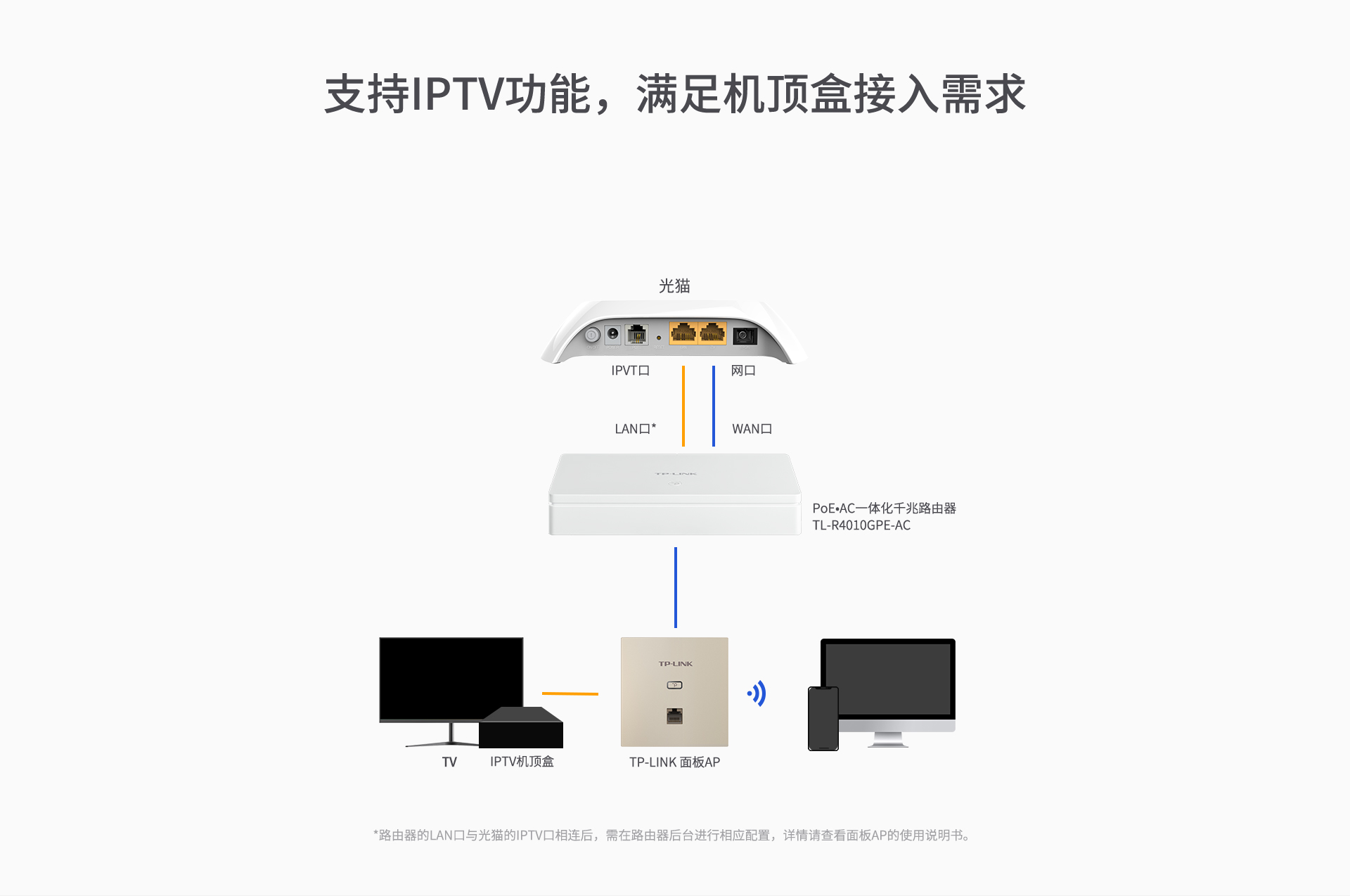支持网口与IPTV口复用,配合TP-LINK PoE?AC一体化路由器,仅需简单配置即可将网口设置成IPTV口,