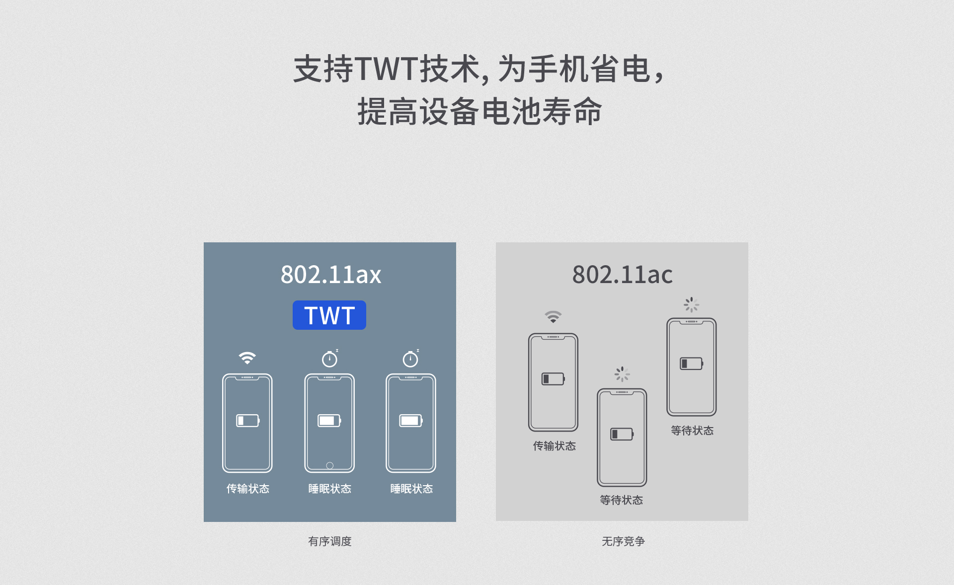 Wi-Fi 6(802.11ax)支持TWT技术,AP可以统一调度无线终端休眠和数据传输的时间,