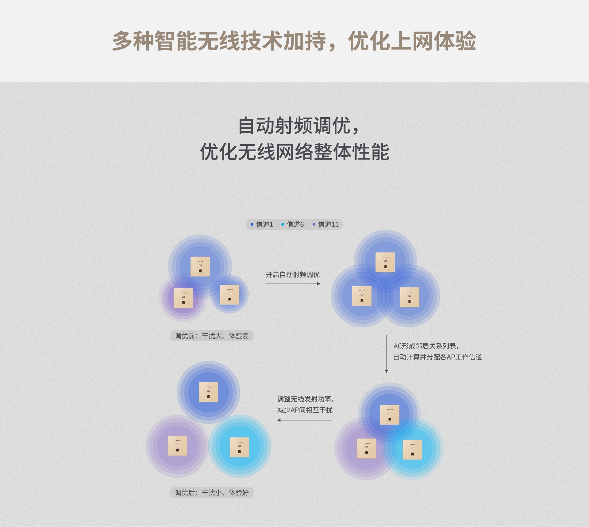 自动调整无线发射功率和信道,保证整体无线网络始终处于高速、高性能的运行状态。