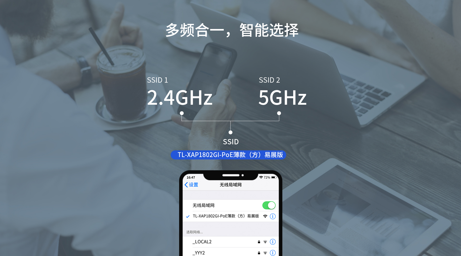 采用多频合一技术,将2.4GHz、5GHz多个频段合并为1个共同的SSID,使用相同的配置。
