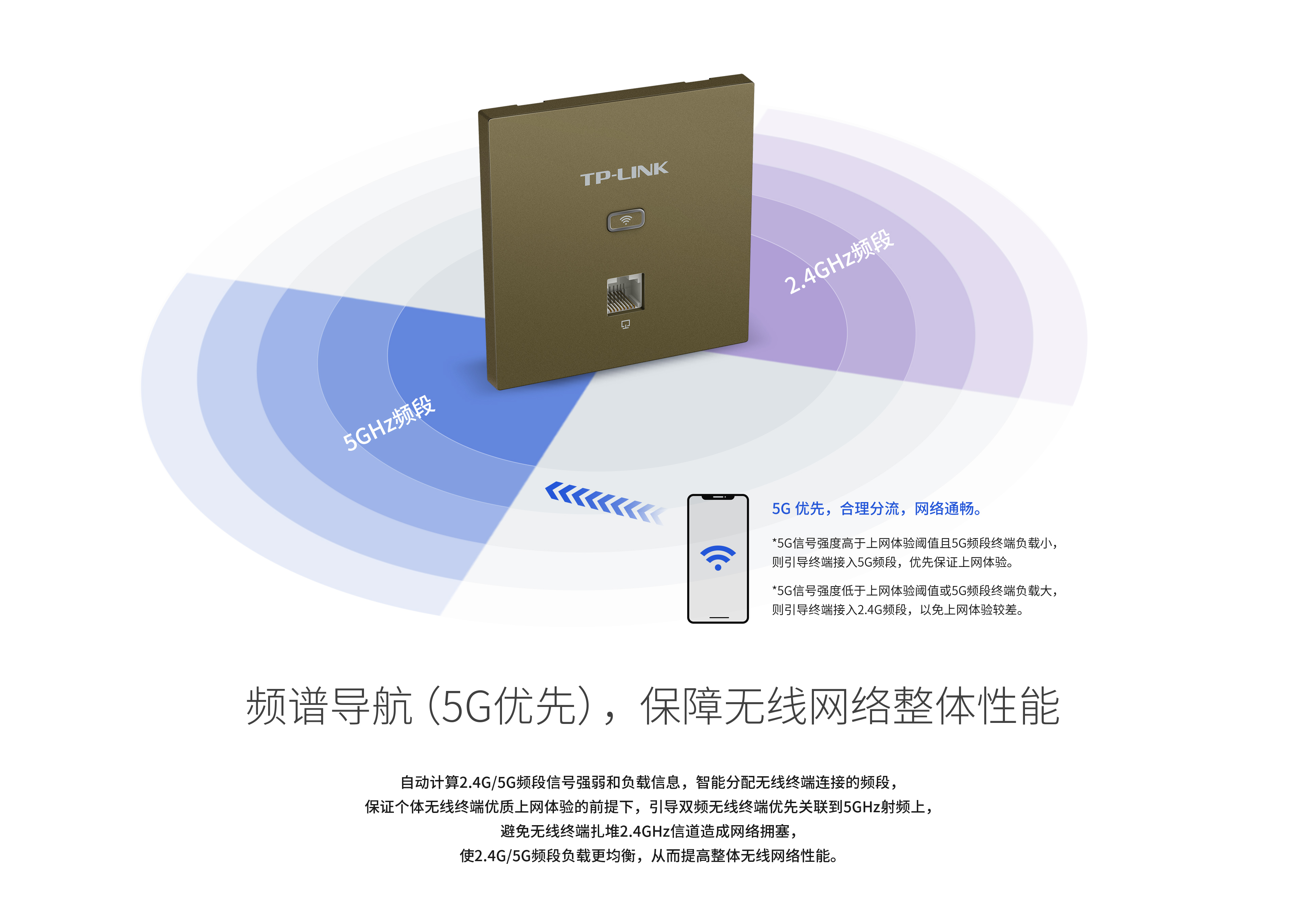 频谱导航,引导双频客户端优先连接5GHz,使2.4GHz 和5GHz 两个频段负载更均衡,保障网络性能