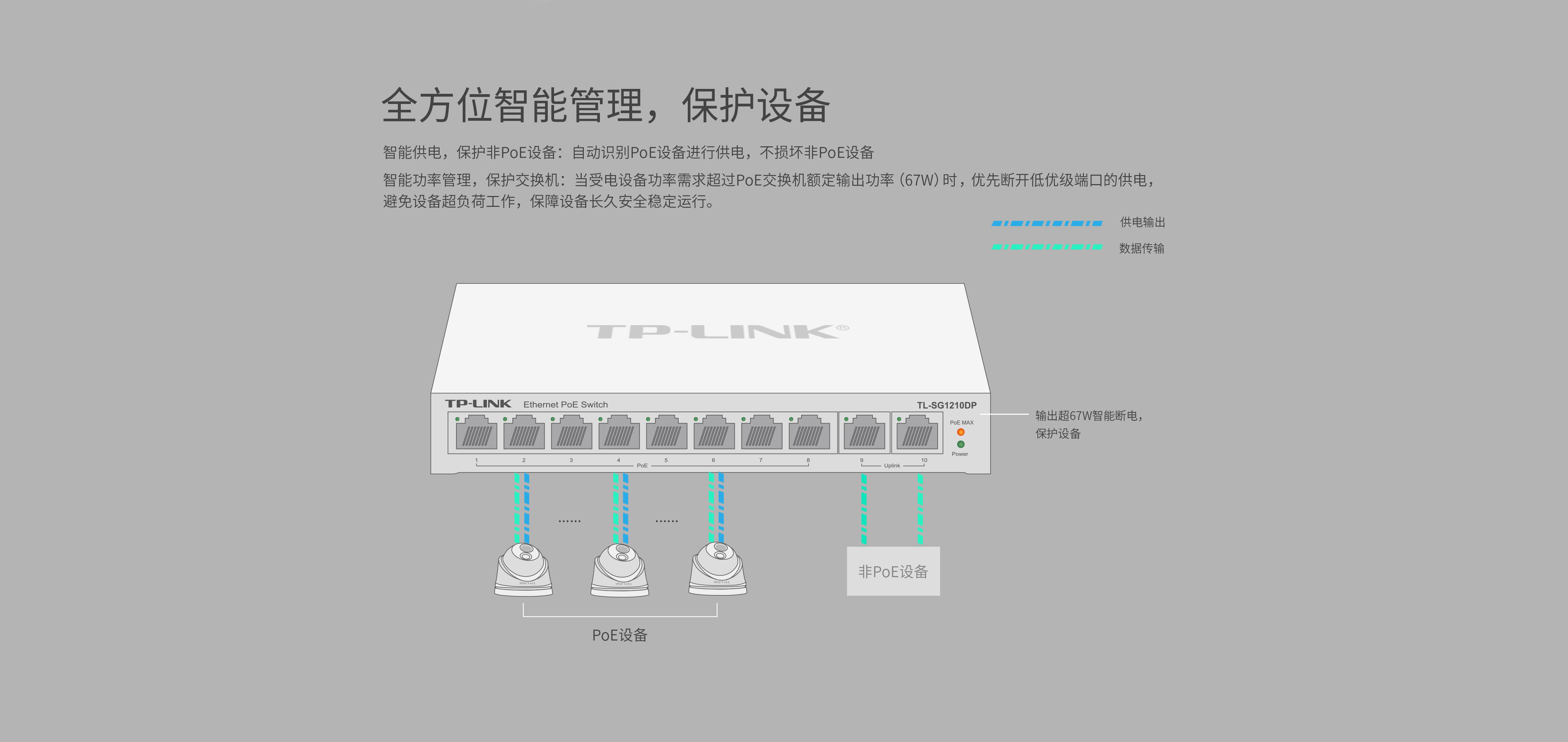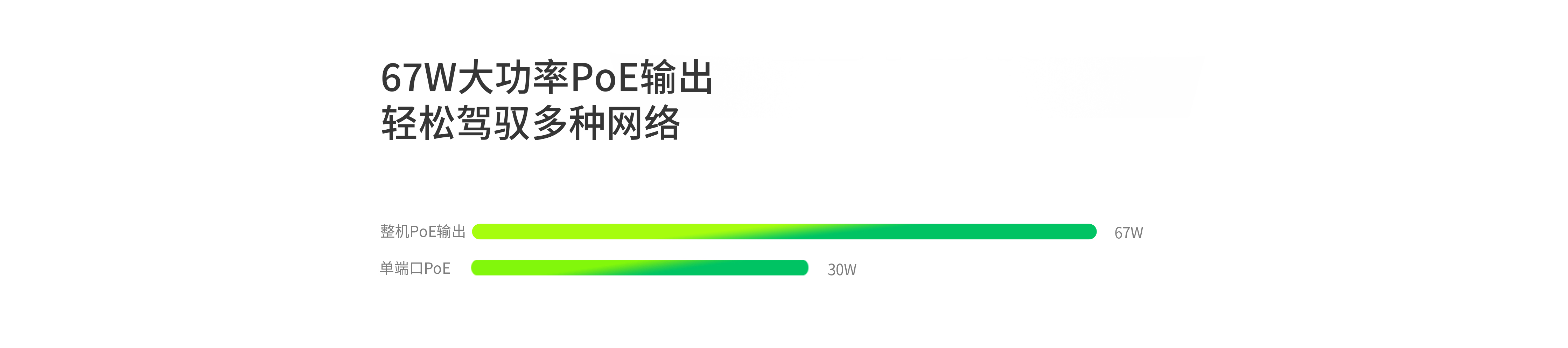 - 整机最大PoE供电功率达67W,单端口最大PoE供电功率为30W