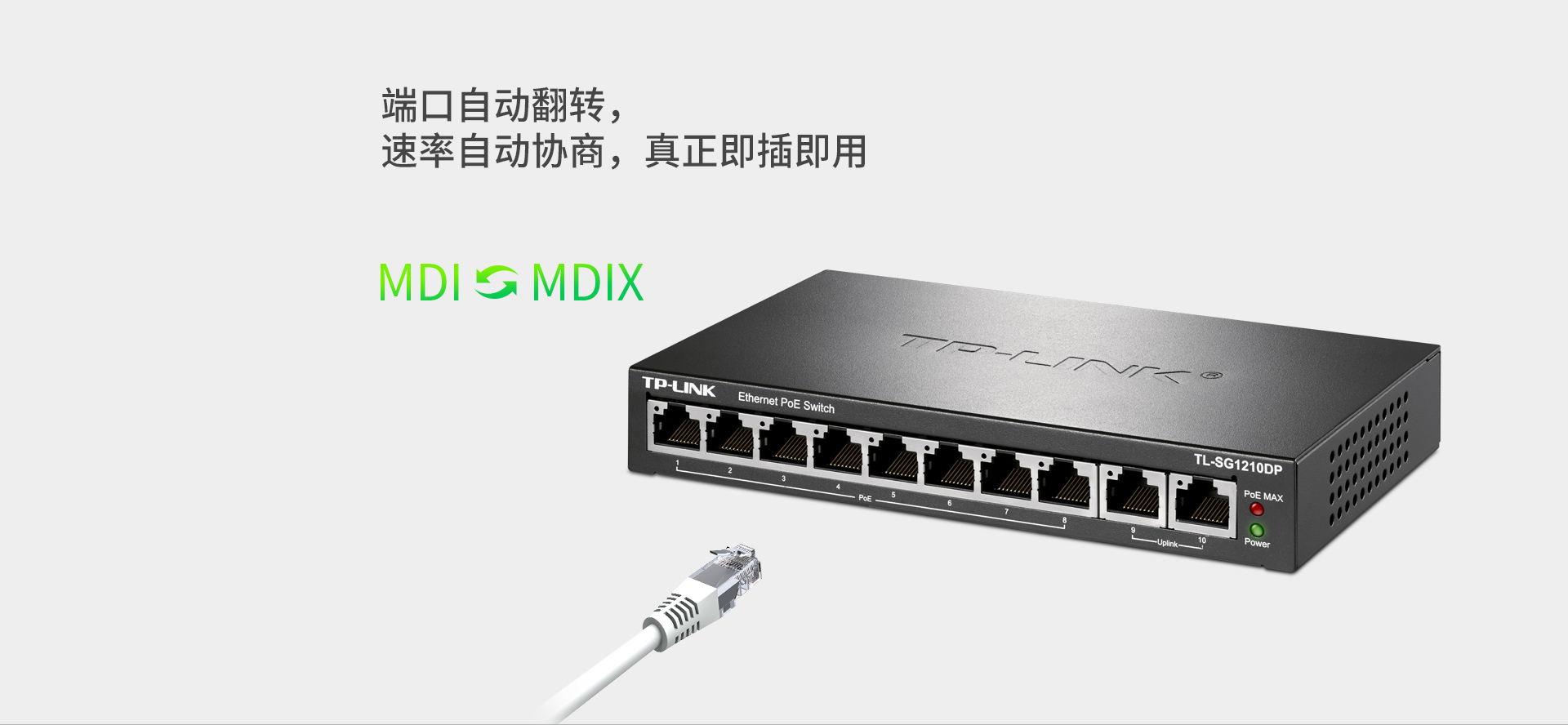 根据插入网线的类型,可自动进行MDI/MDIX翻转,并自动协商端口工作速率,