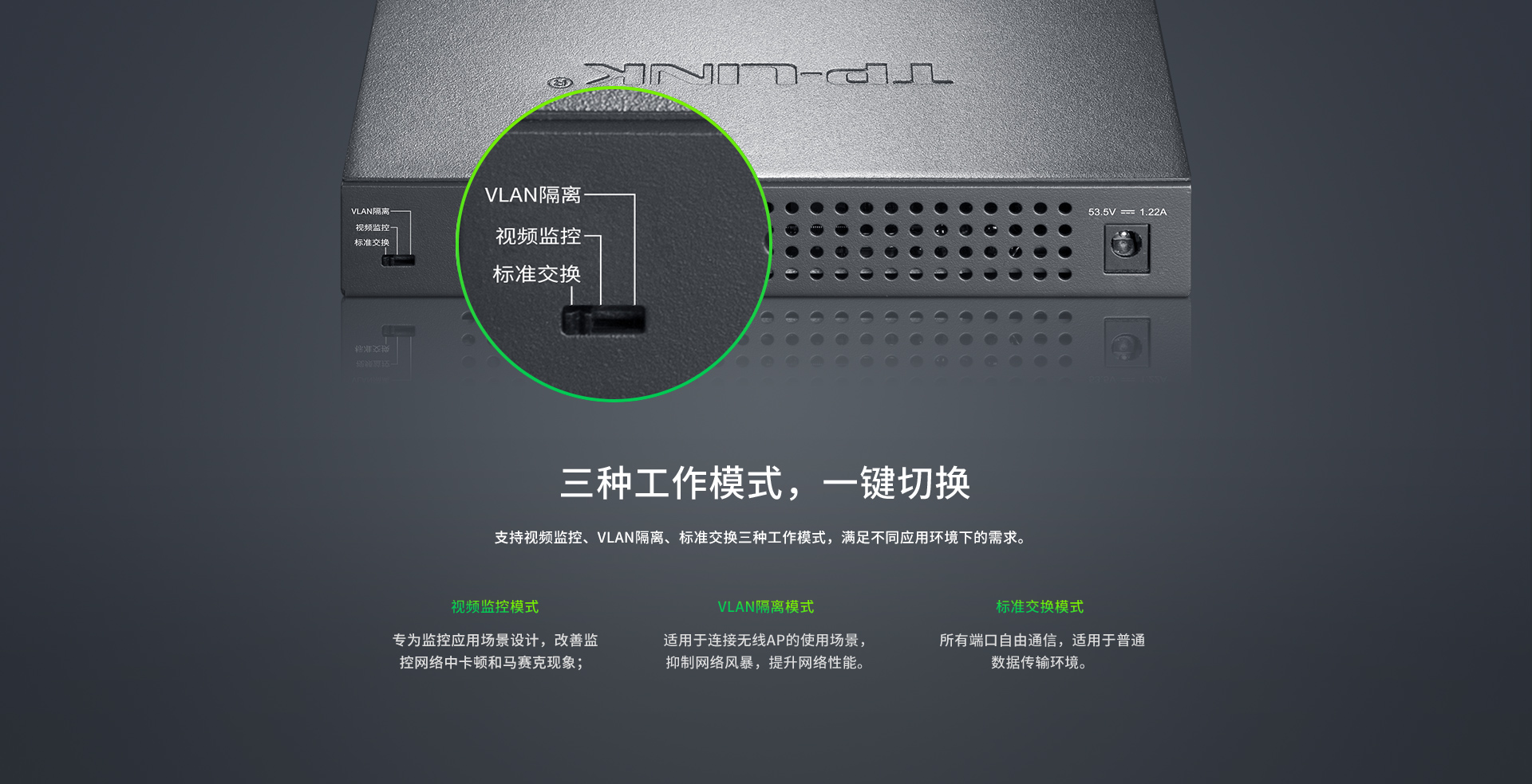 - 支持视频监控、VLAN隔离、标准交换三种工作模式制