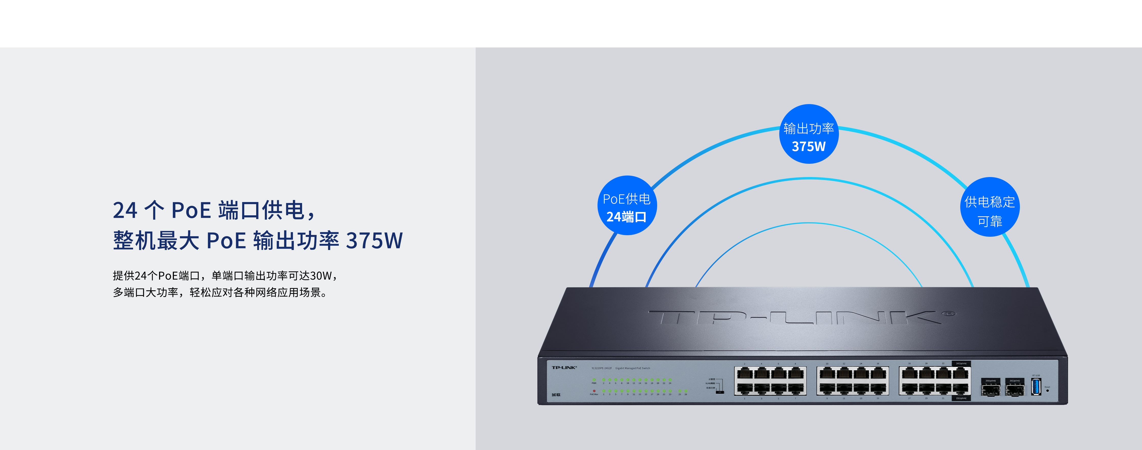 - 整机最大PoE供电功率为375W,单端口最大PoE供电功率为30W