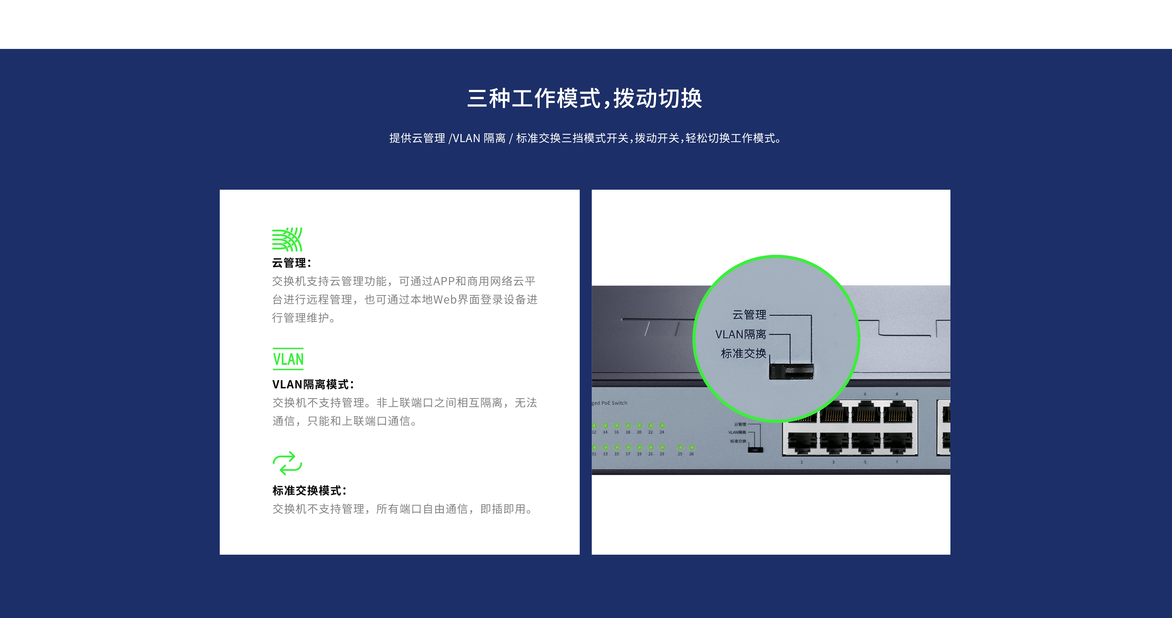 - 支持云管理、VLAN隔离、标准交换三种工作模式