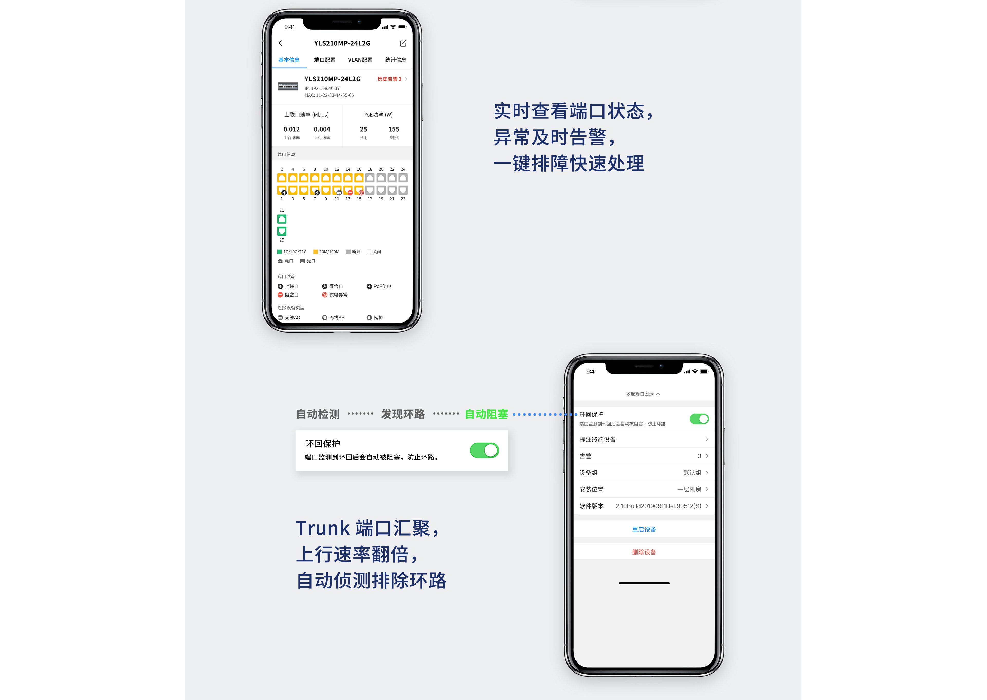 支持端口汇聚,可提供更高上行速率。 智能环路