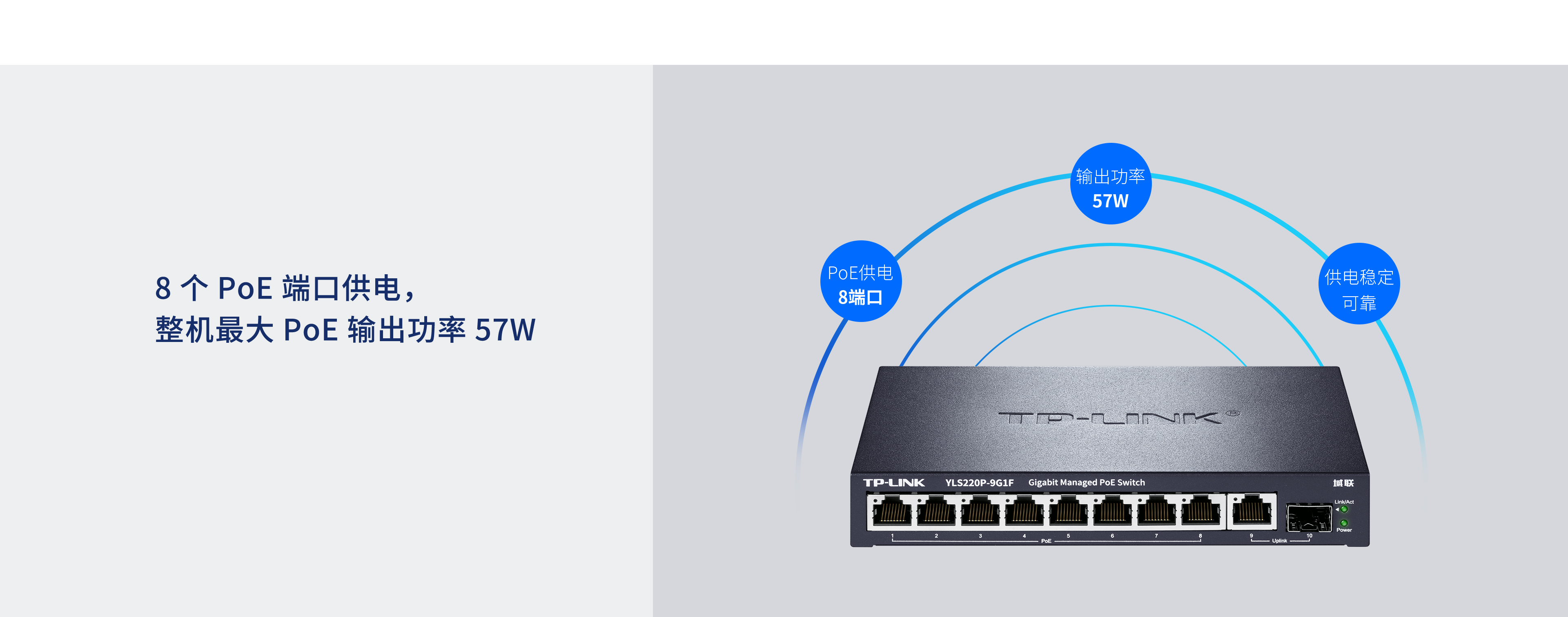 提供8 个PoE端口,单端口输出功率可达30W,