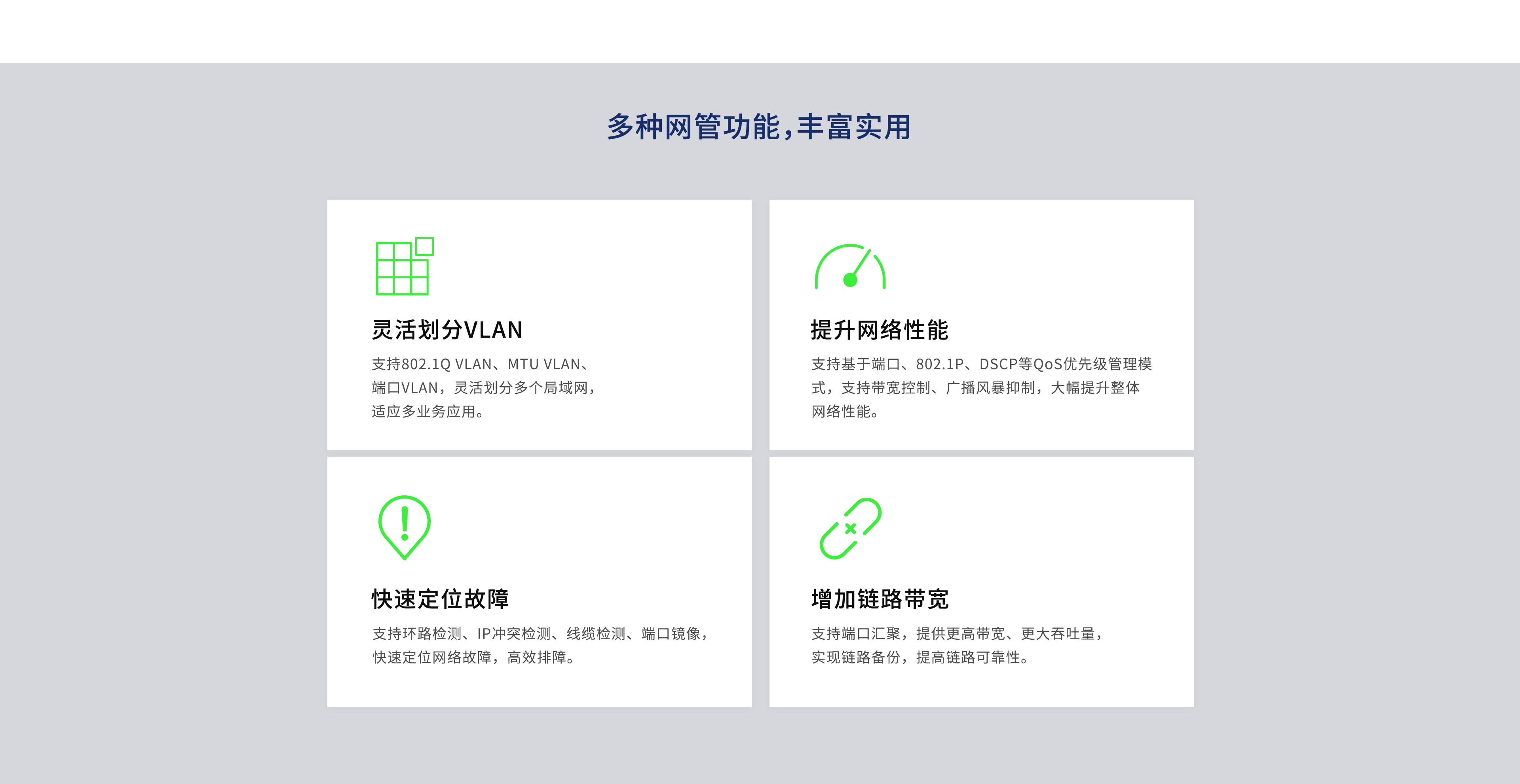 • 支持端口汇聚、端口流量统计、端口监控、线缆检测、环回保护