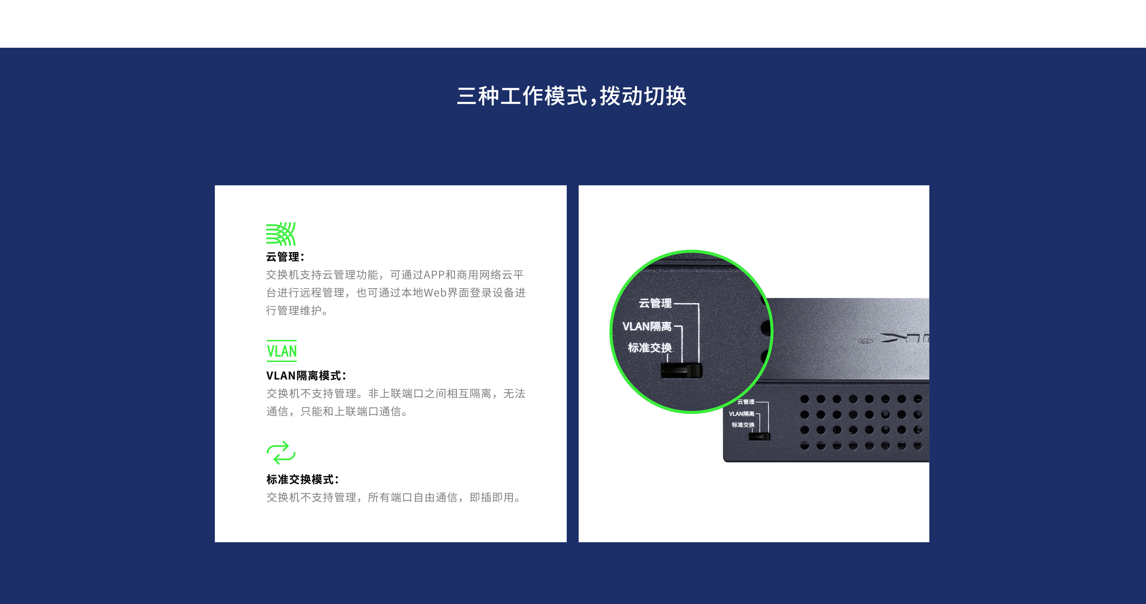 提供云管理/VLAN隔离/标准交换三挡模式开关,拨动开关,轻松切换工作模式。