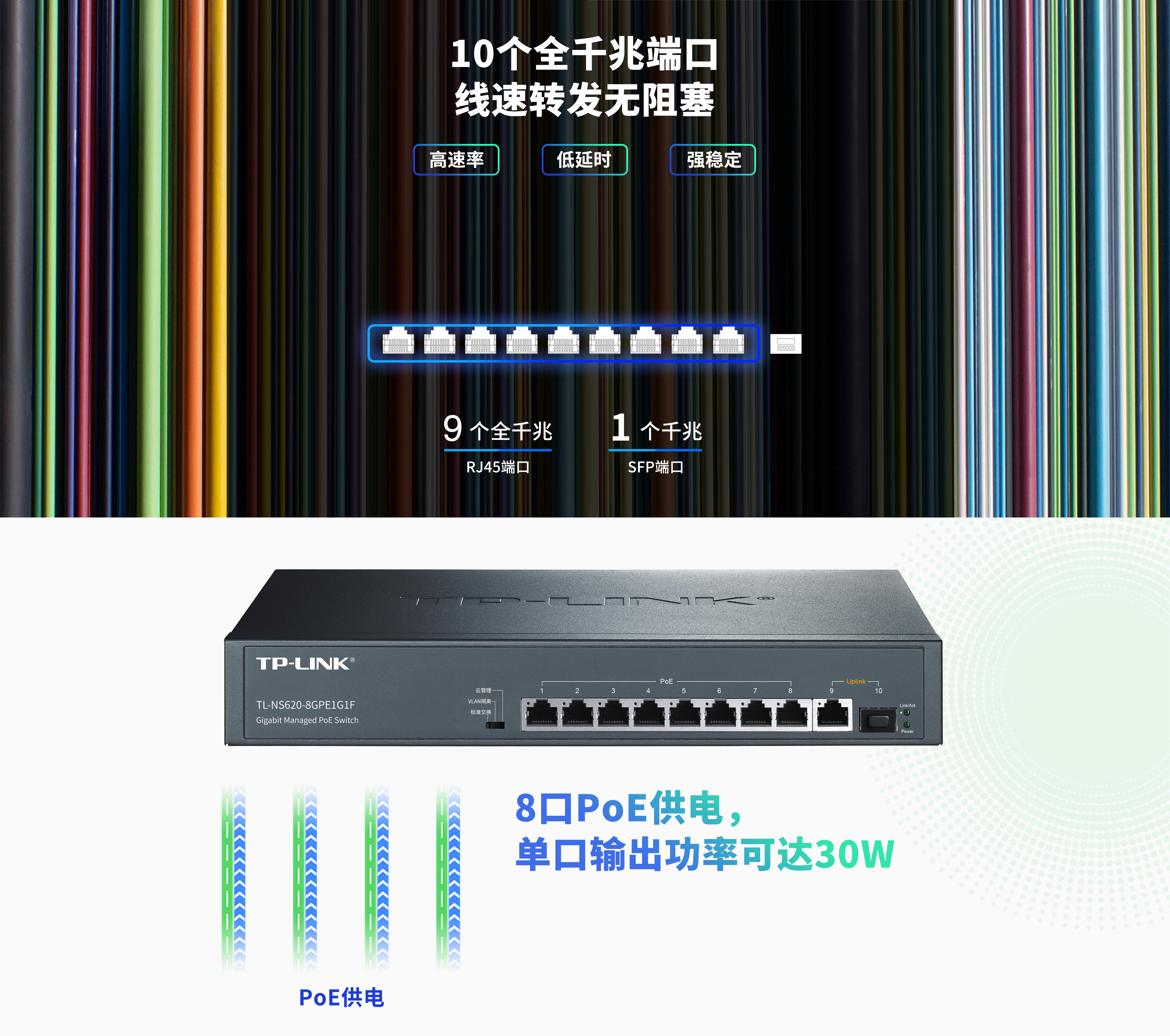 TL-NS620-8GPE1G1F 1~8号端口支持PoE+供电,