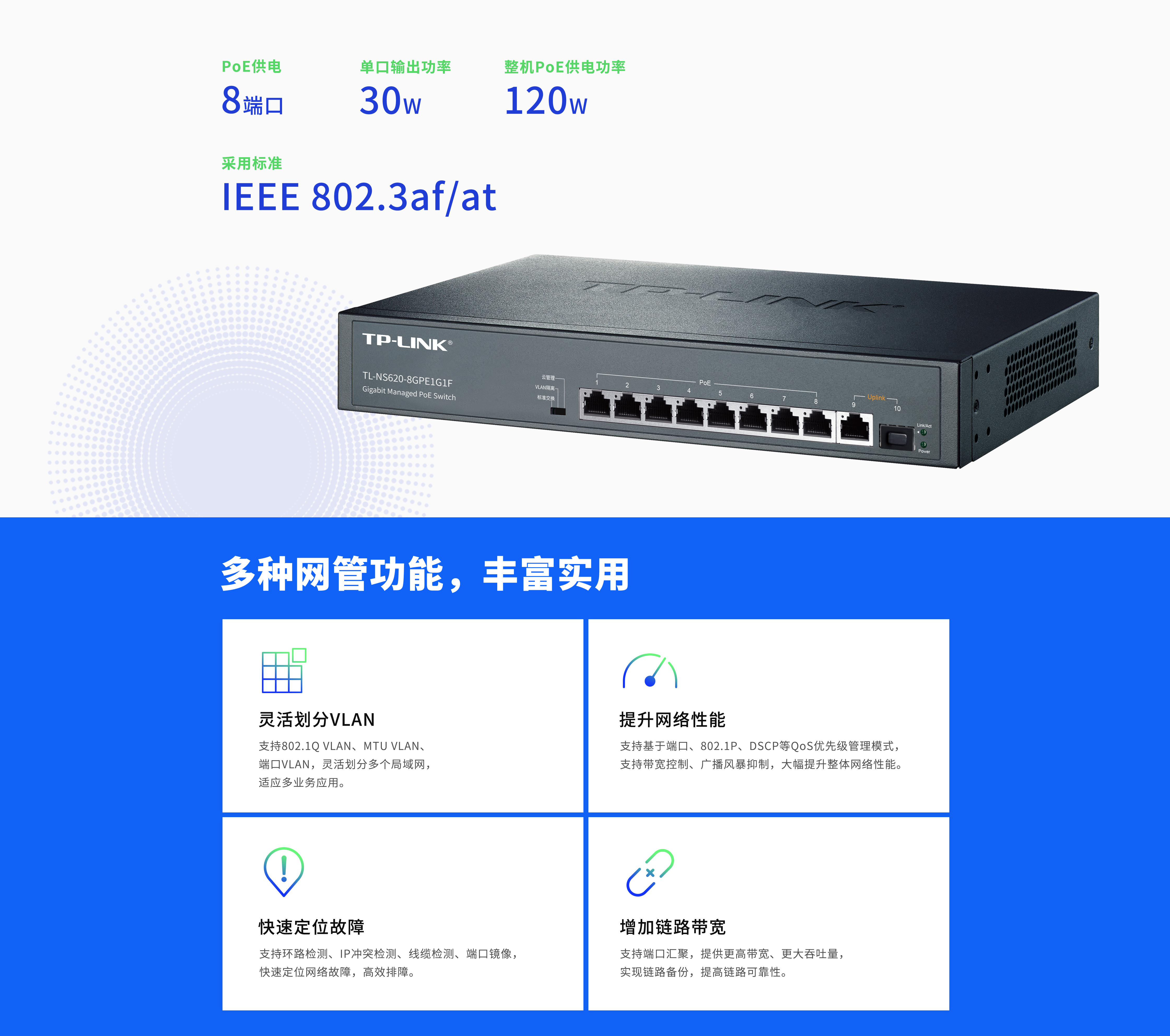 802.3af/at标准,整机PoE供电功率可达120W,