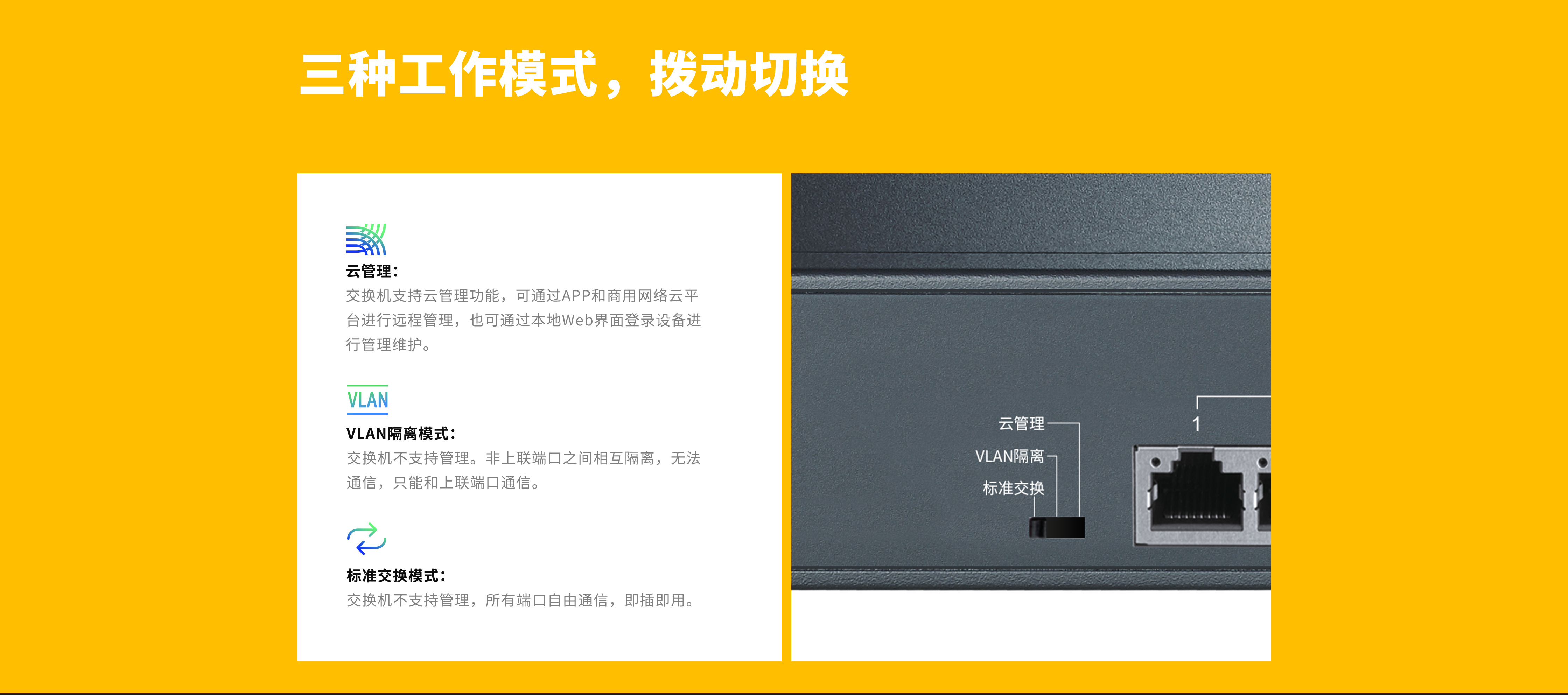 提供云管理/VLAN隔离/标准交换三挡模式开关,拨动开关,轻松切换工作模式。