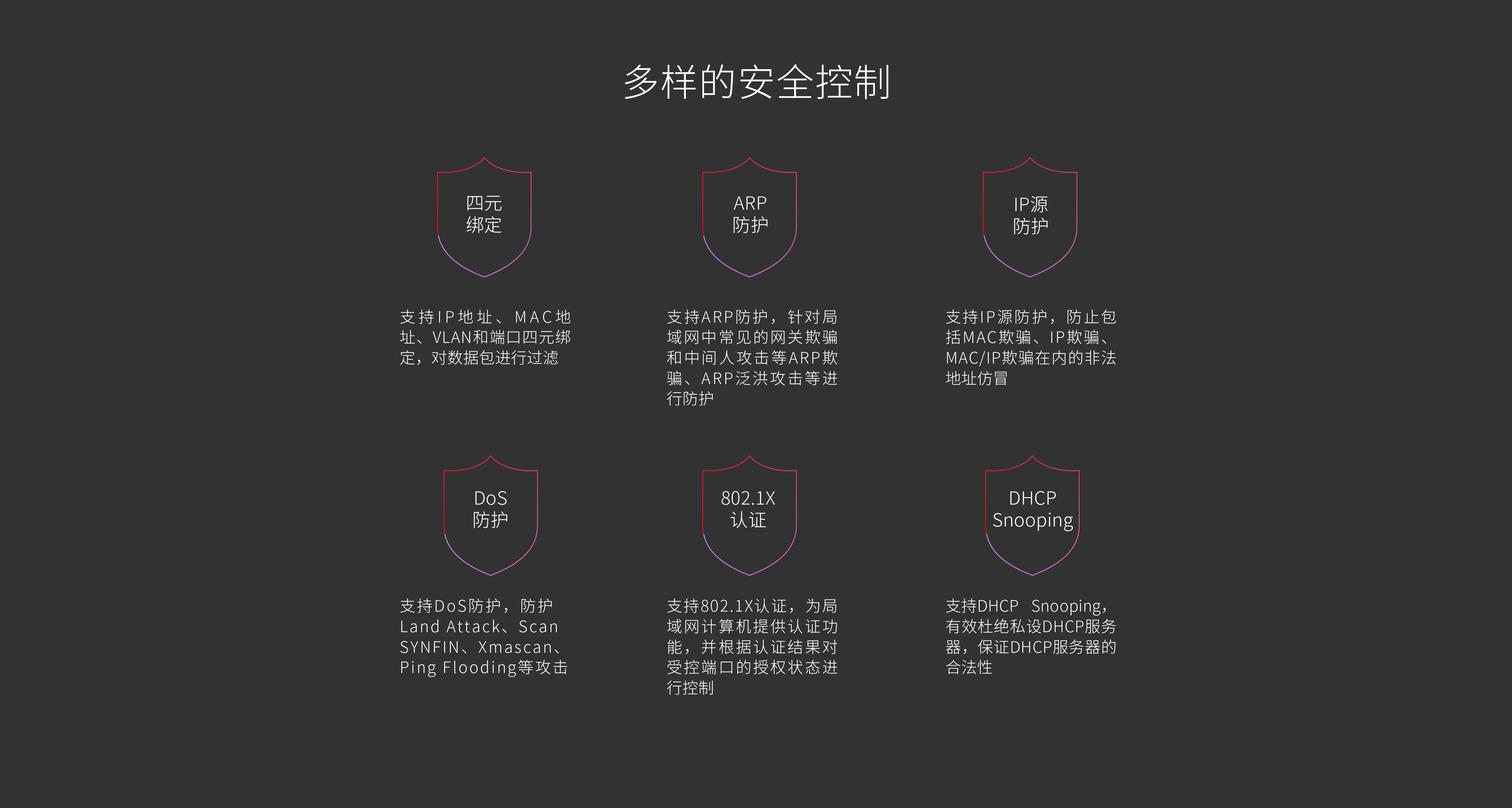 - 支持四元绑定、ARP/IP/DoS防护、802.1X认证