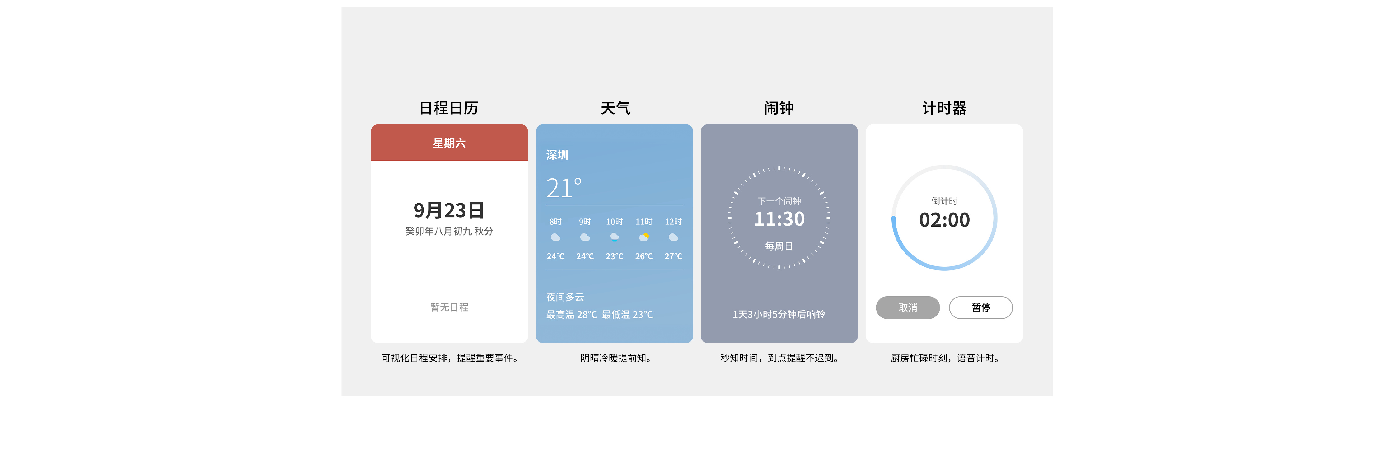 - 支持闹钟、日程、计时器、天气等常用小工具