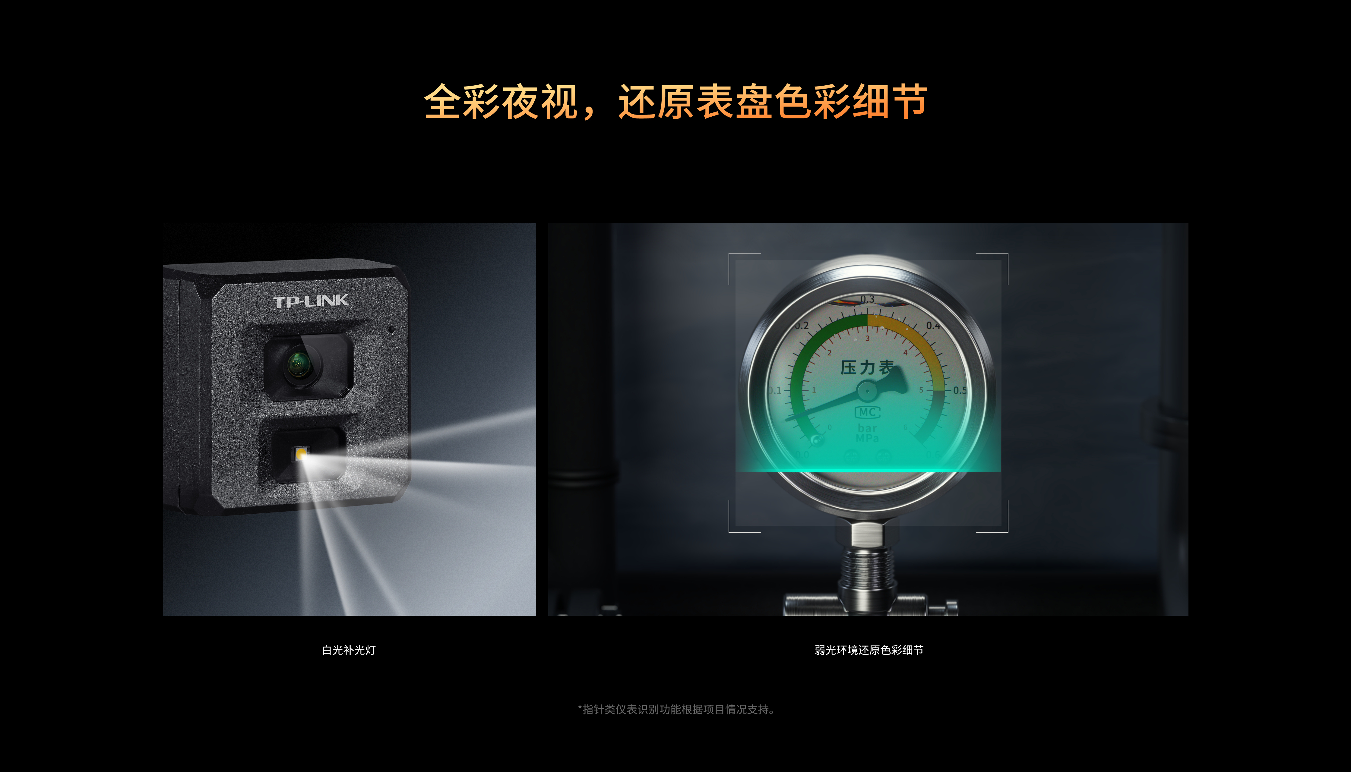 摄像机自带白光补光灯,弱光环境下也能清晰识别表盘,