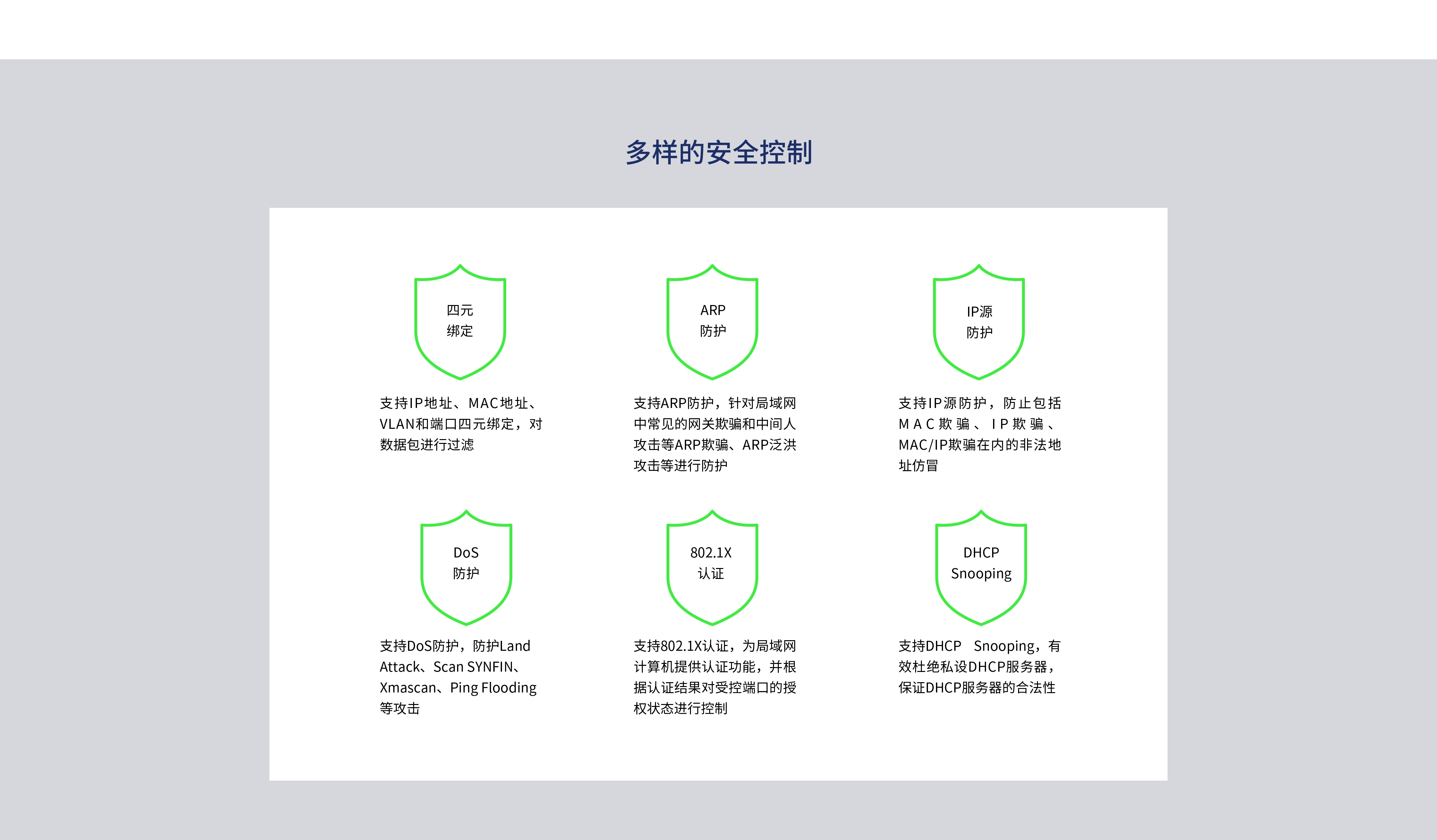 - 支持四元绑定、ARP/IP/DoS防护、802.1X认证