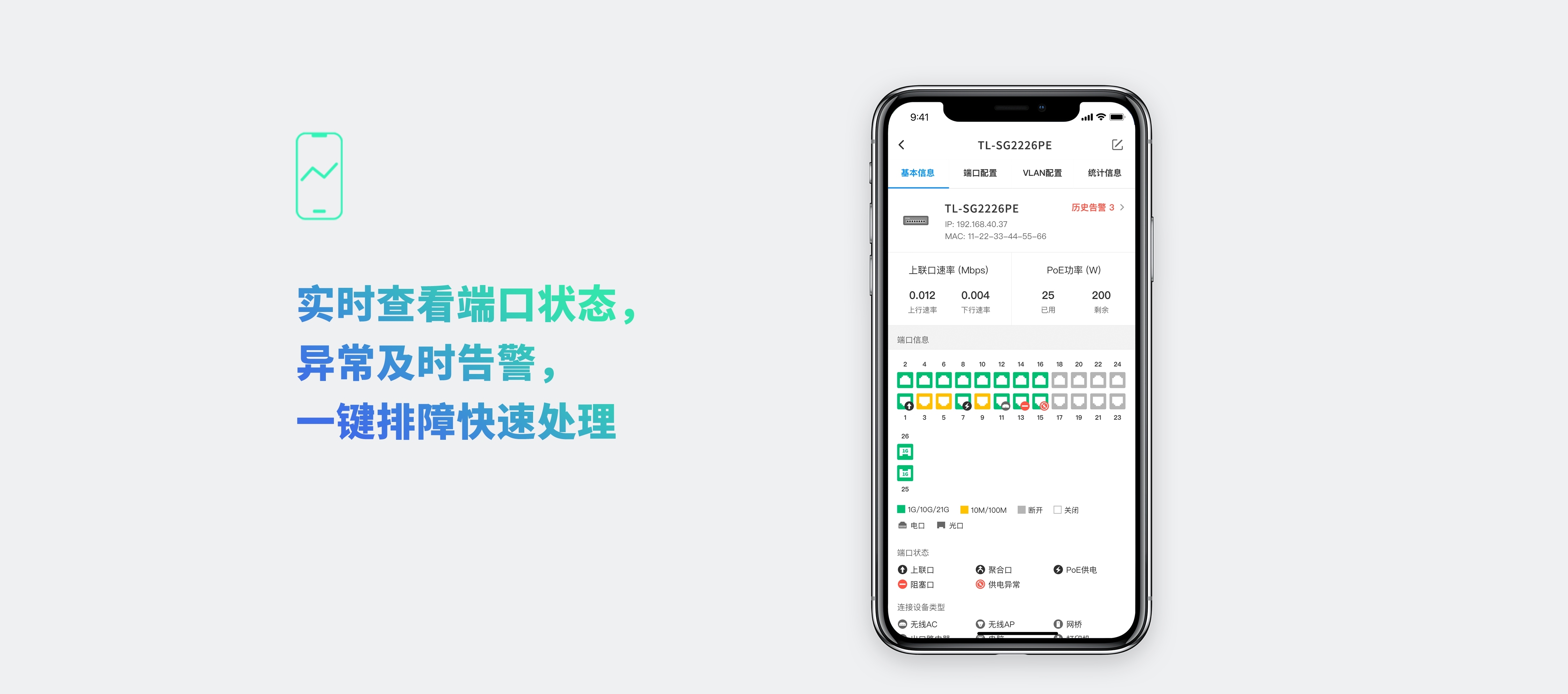 - 支持端口汇聚、端口流量统计、端口监控、线缆检测、环回保护