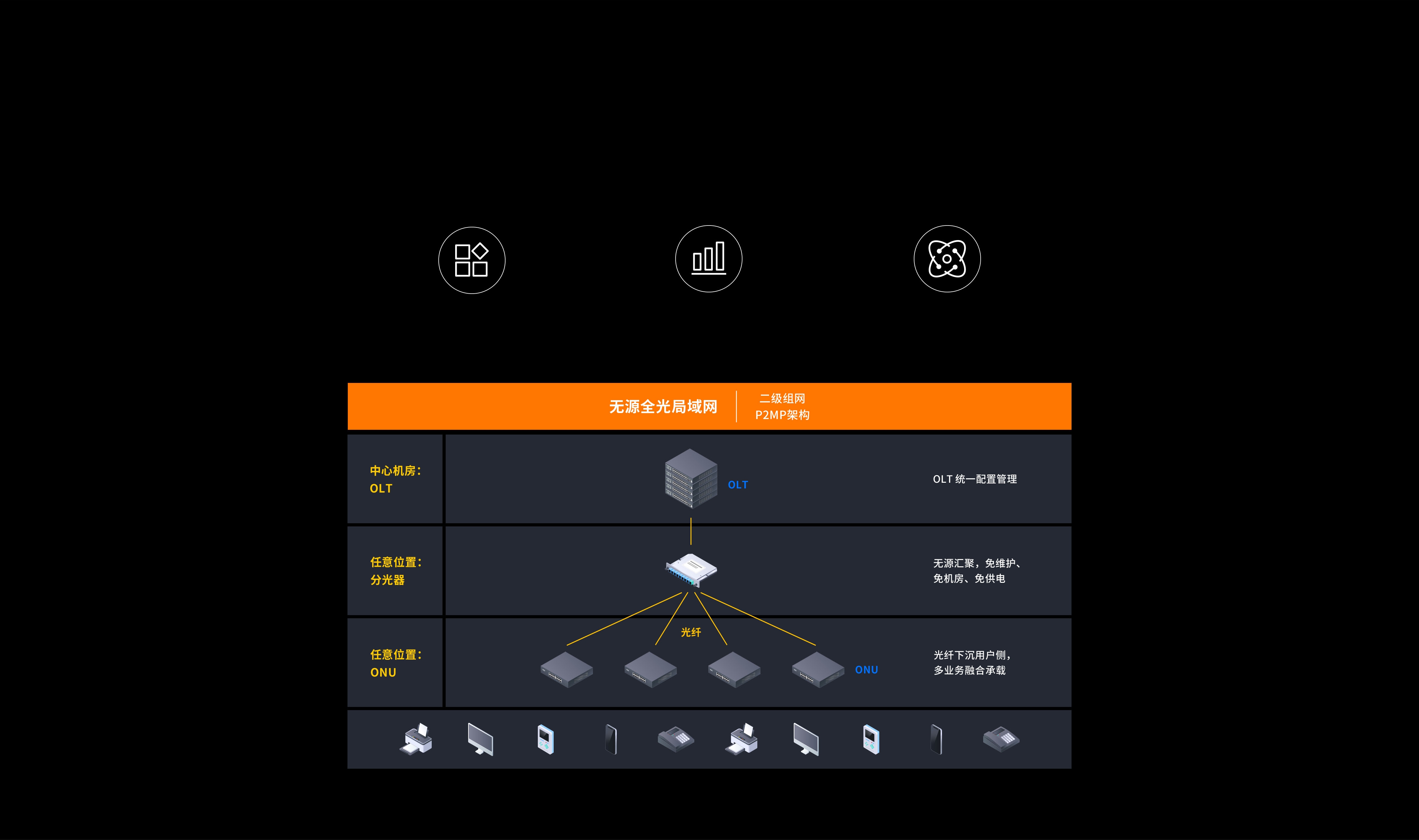 通过一张光纤网络实现多业务融合承载,通过P2MP二层架构让网络易扩展易维护,