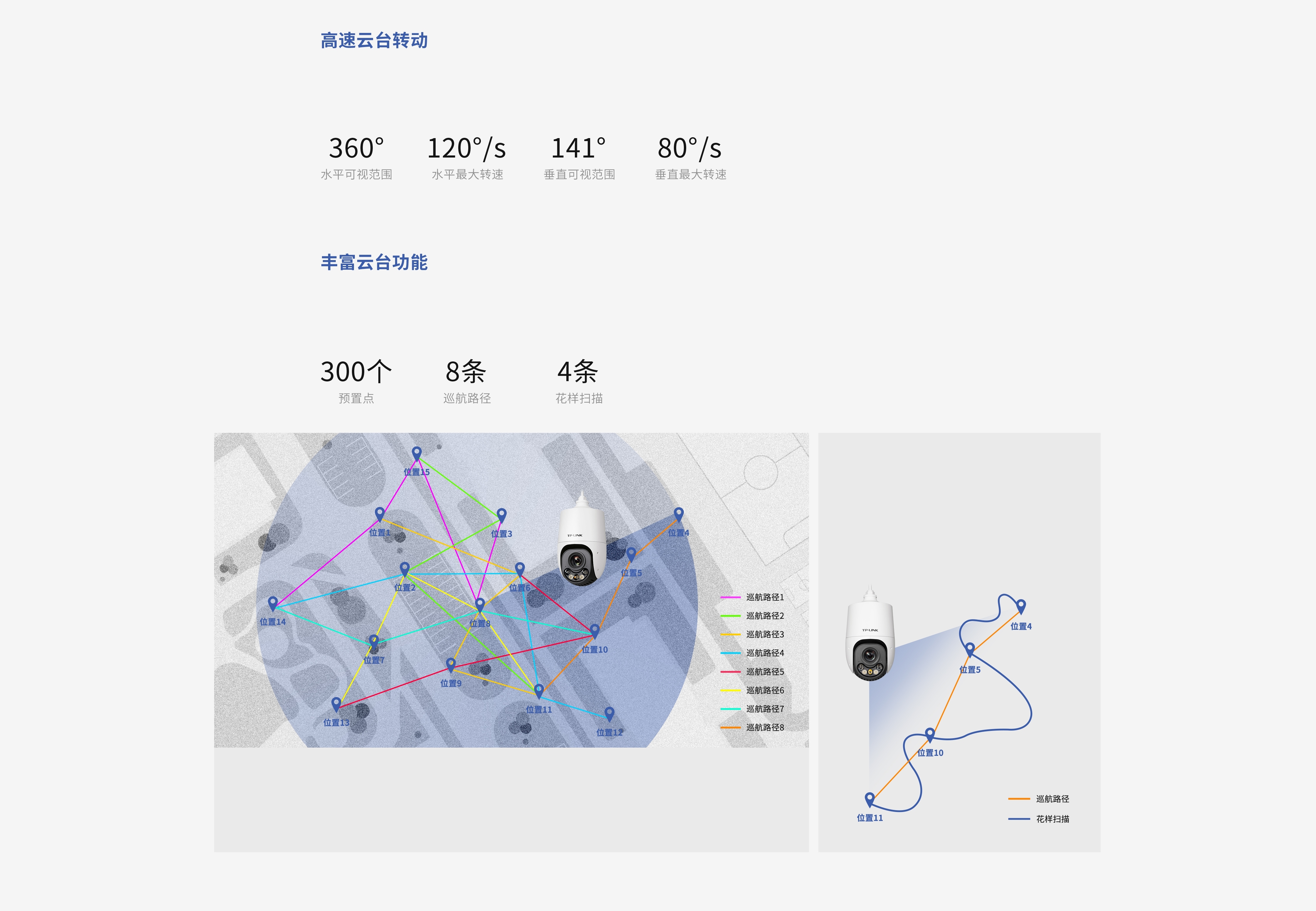 支持3D定位、预置点、一键巡航、一键守望、花样扫描等云台控制功能,